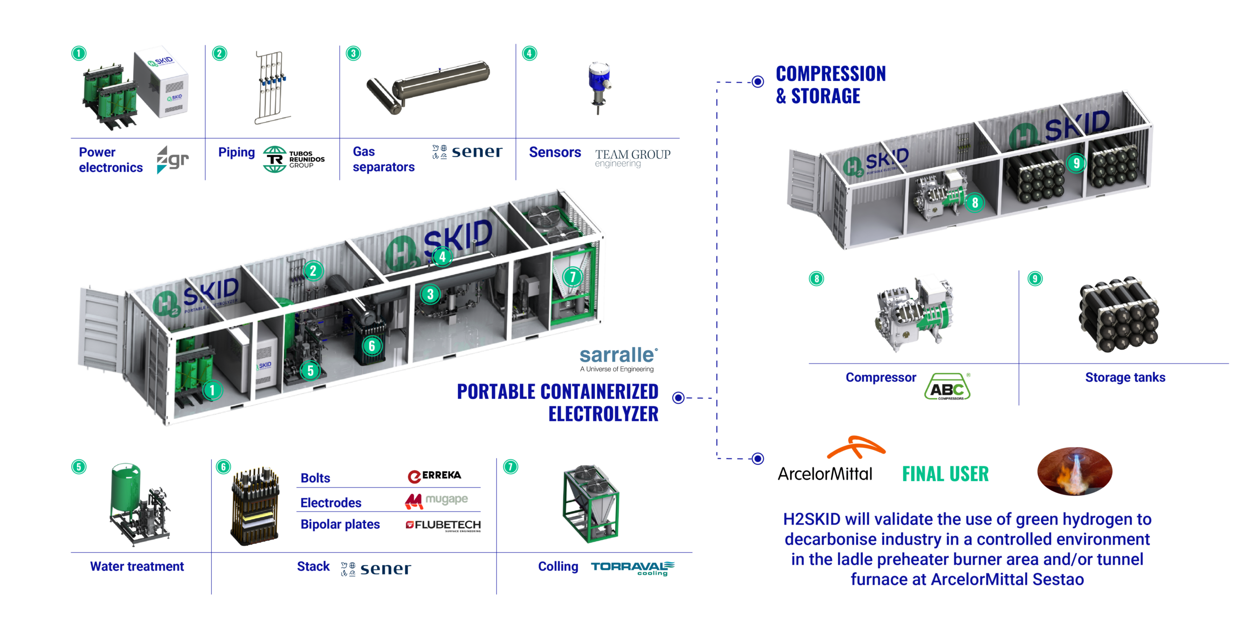 H2SKID project aims to develop an experimental 1.25 MW portable electrolyzer using AEM/PEM technology, which is conceived as an enabling solution for supplying green hydrogen to end-user industrial customers. Led by SARRALLE as the coordinating entity, the project also includes the participation of 10 leading companies from across the hydrogen value chain and is a unique initiative in the Basque Country, aimed at promoting industrial decarbonization.